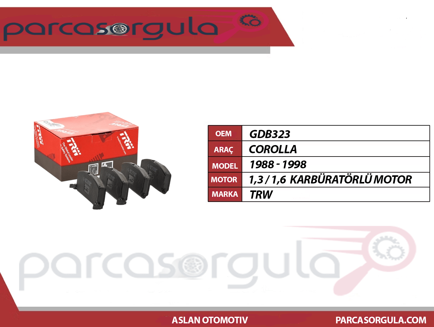 Trw Fren Balatası Ön Corolla 1,6 1988-1994 /Corolla 1,3 1988-1998 Karbüratörlü ( GDB323 )